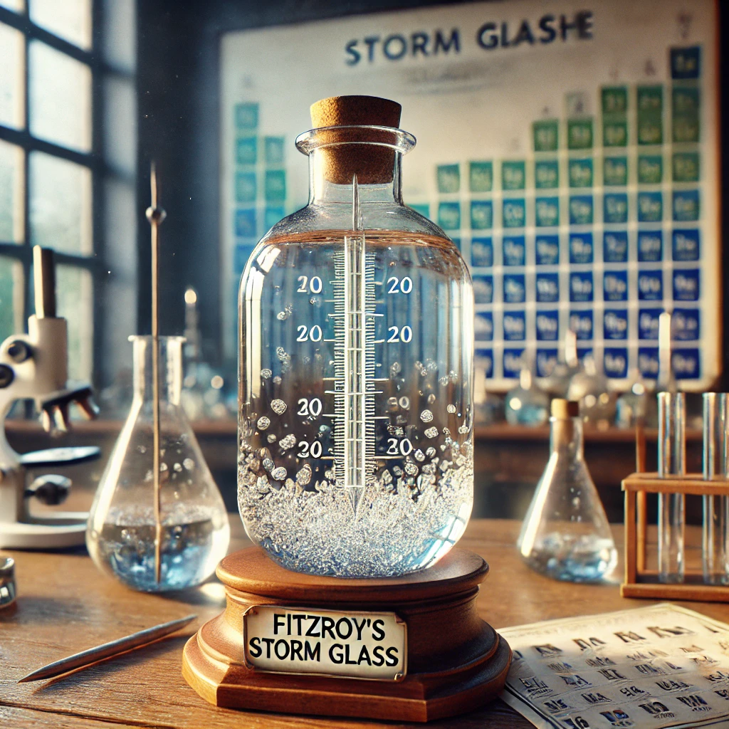 To właśnie obserwacje pogodowe podczas żeglugi umożliwiły testowanie urządzenia znanego jako Storm Glass, dzięki któremu również dziś możemy przewidzieć zmiany pogody. Mieszanina soli nieorganicznych (azotanu(V) potasu i chlorku amonu) oraz kamfory, rozpuszczona w etanolu i wodzie zmienia swoją postać w zależności od warunków pogodowych. Piękne igły i nitki pływające na powierzchni oznaczają wietrzną aurę, kryształy na dnie świadczą o zbliżających się przymrozkach. Drobne kryształy w roztworze to zapowiedź mgły, zaś zaparowane szkło latem będzie świadczyło o zbliżającej się burzy.