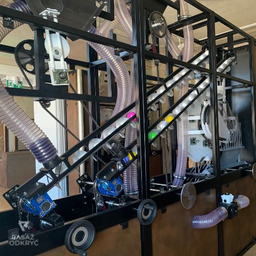 - olbrzymiej machiny, wypełniającej całą przestrzeń i pozwalającej poznać zasady działania śruby Archimedesa, różnorodnych przekładni, taśmociągów, zaworów i pokręteł – a to wszystko służy do określania ścieżki, jaką przebyć ma niewielka piłka.