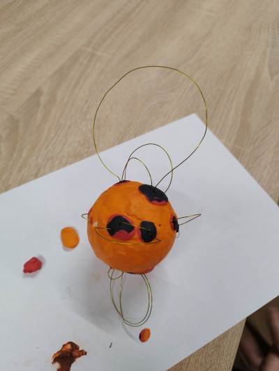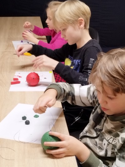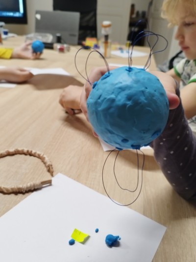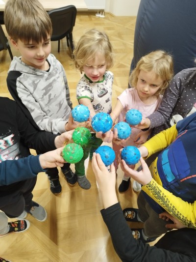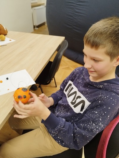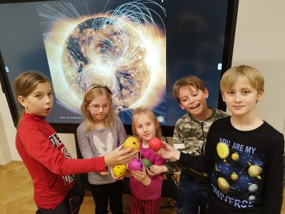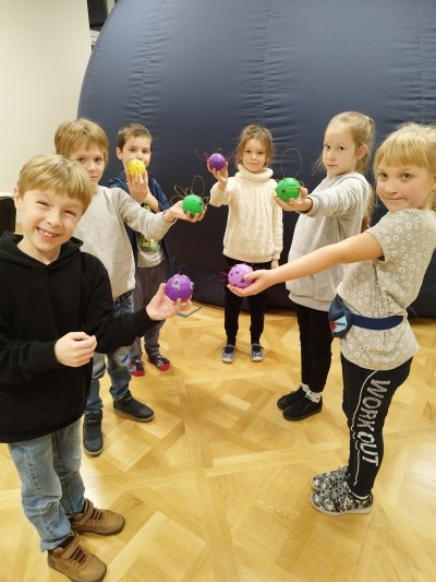 Na ostatnich zajęciach dzieci bliżej poznały naszą dzienną gwiazdę - Słońce. Dowiedziały się, że świeci ono we wszystkich kolorach tęczy! Na Słońcu są plamy i ma ono swoje pole magnetyczne. Wiedza ta, będzie utrwalana w pamięci dzieci przy każdym spojrzeniu na świąteczną choinkę. Na zajęciach każde z nich stworzyło bombkę w postaci Słońca z polem magnetycznym i plamami.