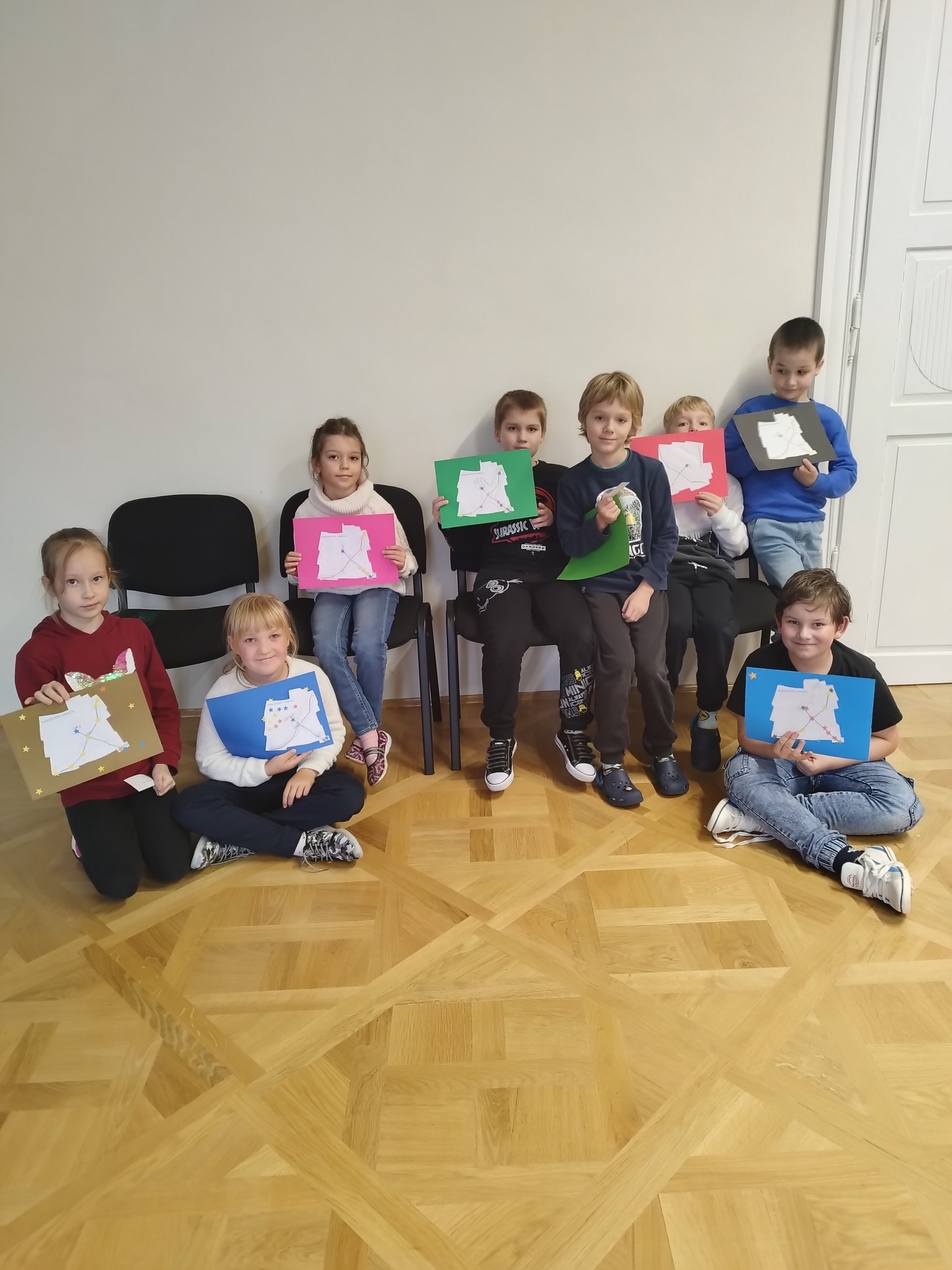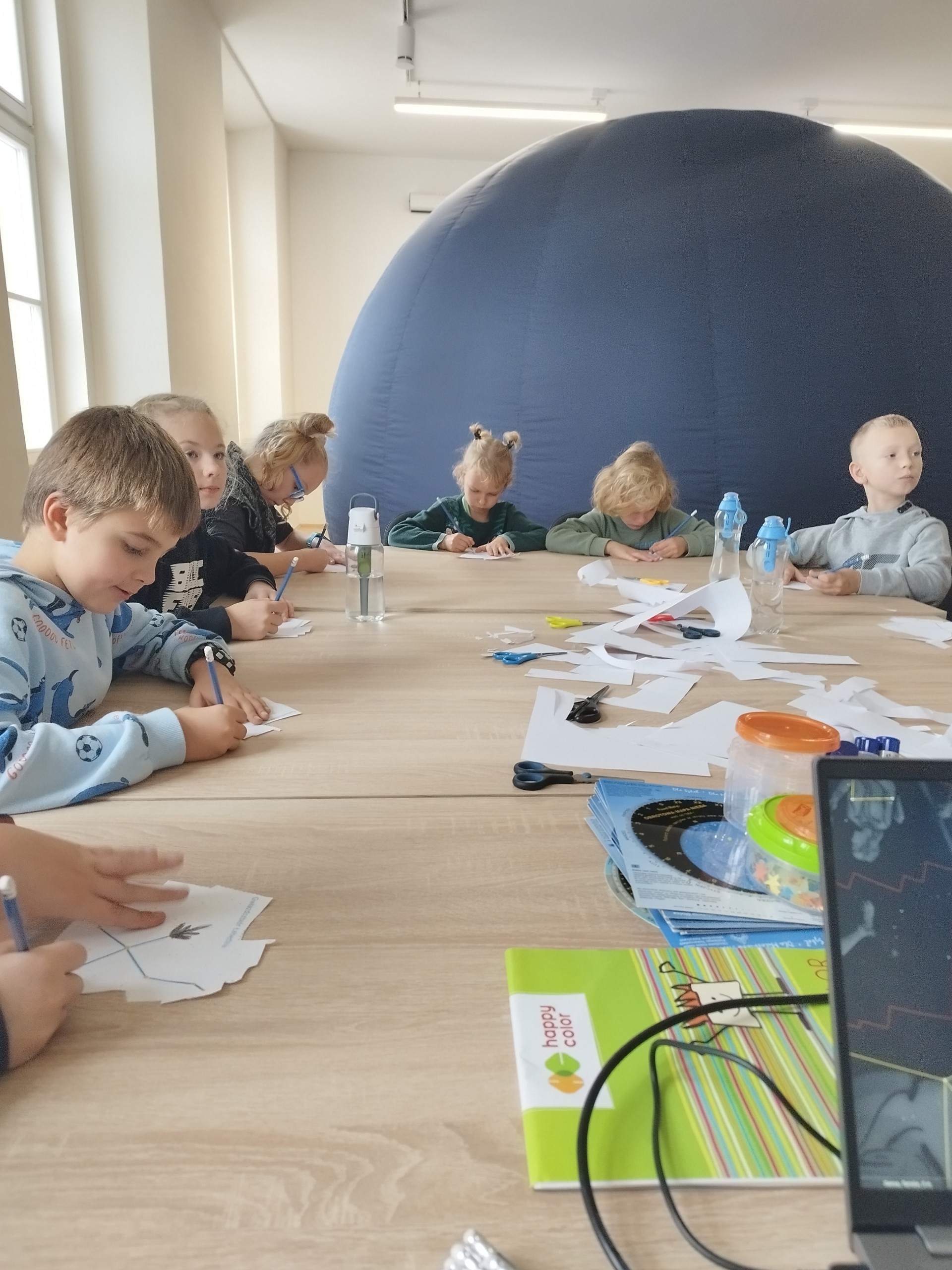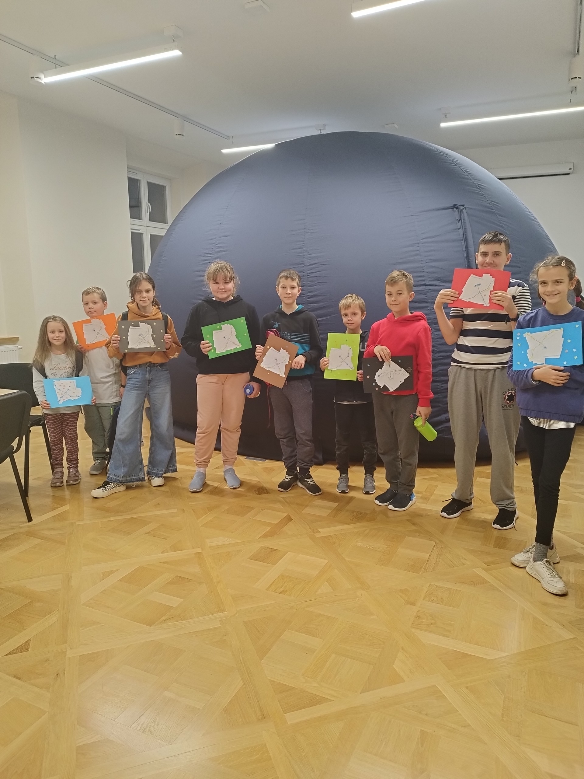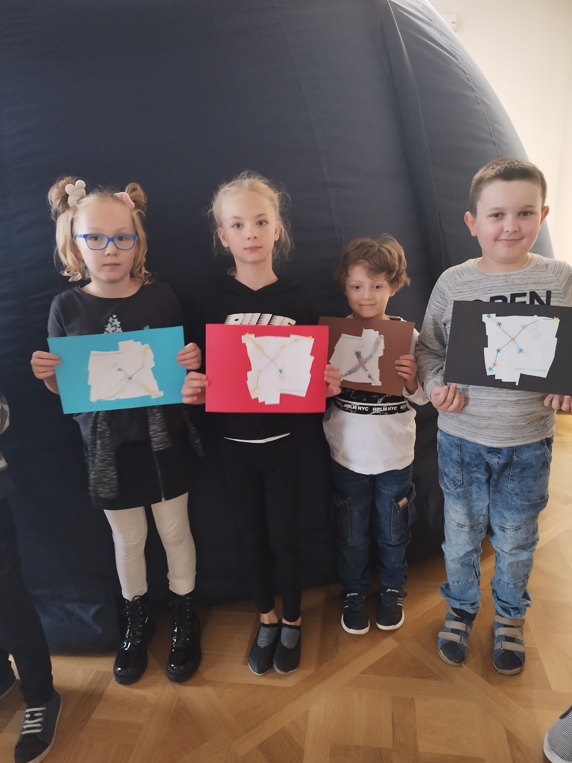 W kolejnym tygodniu już wszyscy śmielej podjęli wyzwanie i zapoznaliśmy się z gwiazdozbiorami na nocnym niebie. Radości nie było końca, gdy podziwialiśmy wspólnie gwiazdy w planetarium. Tam odnajdywaliśmy najpiękniejsze gwiazdozbiory jesiennego nieba. Uczestnicy zwrócili uwagę na gwiazdozbiór Łabędzia, który znajduje się w pasie Drogi Mlecznej. A kolorowe gwiazdy ułożyły się w charakterystyczny kształt, który znalazł się na naszych pracach.