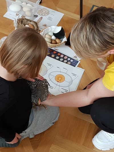 Wtrakcie warsztatów odpowiedaliśmy ma pytania takie jak: dlaczego ptaki latają, z czego zbudowane jest ptasie jajko i jak pisklę w nim oddycha, jak odróżnić kurę od koguta i po czym poznać że jajko jest świeże.