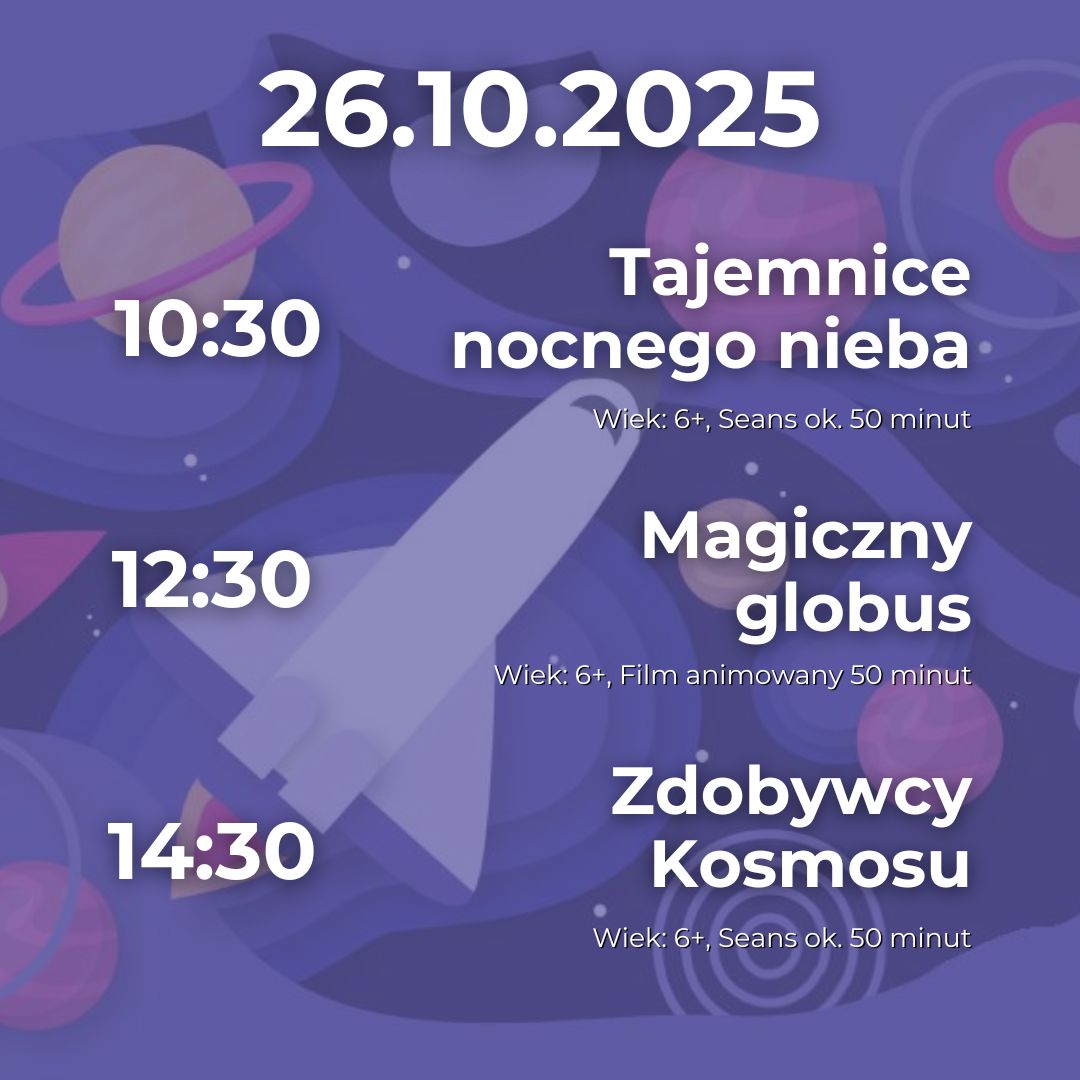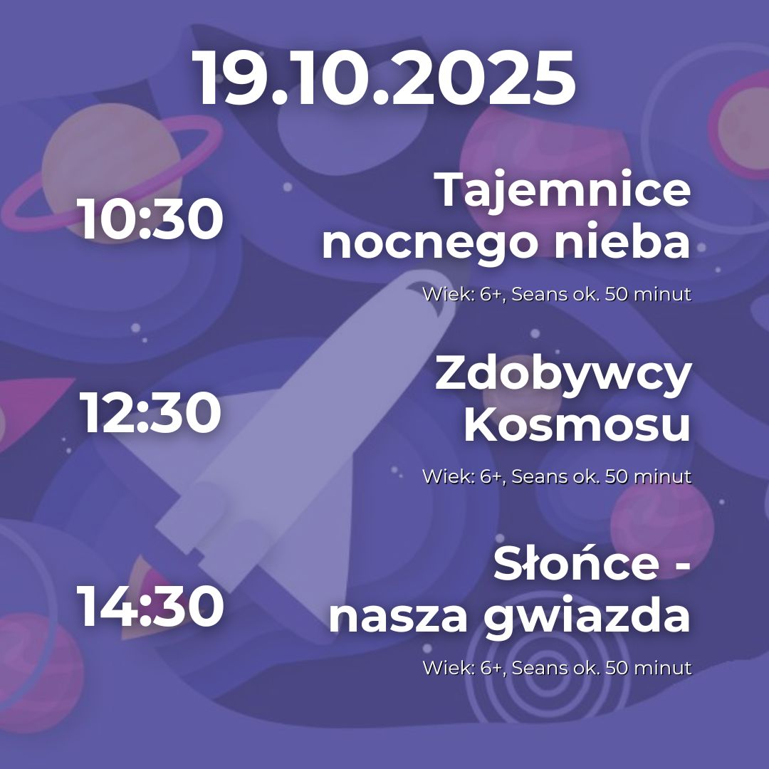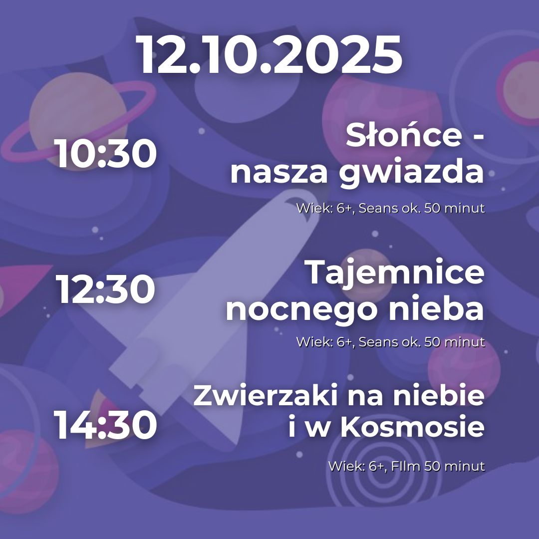 Seanse edukacyjne w Planetarium odbywają się w weekendy zgodnie z zamieszczonym poniżej harmonogramem. Repertuar programowany jest na bieżący miesiąc.